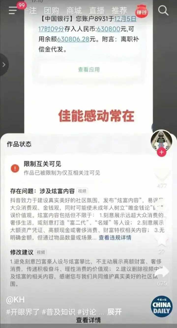 廣東中山的佳能工廠裁員,有位老員工拿到了63萬的補償款,心裏頭高興,順手就在抖音上曬了一下到賬截圖。結果您猜怎麽著?沒過多久,視頻平台就以“涉嫌炫富”為由給下架了!這事兒一出來,網上可就炸了鍋。一個打工人,勤勤懇懇幹了二十年,最後按規矩拿到的合法補償,怎麽就成了“炫富”?那些網紅天天曬豪宅、名包、跑車方向盤,平台睜一隻眼閉一隻眼,輪到老實人曬曬自己的血汗錢,反而犯了忌諱?這雙標玩得,是不是有點太明顯了?