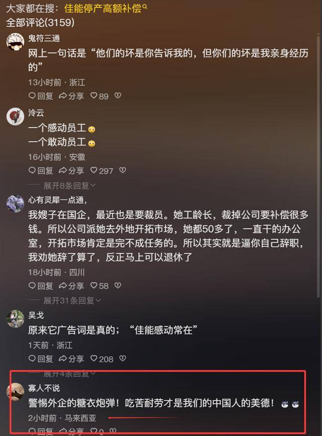 這件事就像一顆石子,扔進了本就不平靜的湖麵,激起的漣漪一層層蕩開,直接戳中了無數打工人的心窩子。評論區裏,各種聲音吵成了一鍋粥,但仔細聽聽,核心就一個:不公,憋屈,還有深深的羨慕。大夥兒想不通:這63萬,是人家二十年青春換來的,一不偷二不搶,合法合規,曬出來高興一下怎麽了?這就叫“刻意展示遠超大眾消費的資產”了?那天天在屏幕上晃悠的、那些真假難辨的奢華生活,又算什麽?平台的審核標準,莫非是專門用來“精準打擊”老實人的?緊接著,關於佳能“大方”的曆史也被翻了個底朝天。遠的像2022年珠海佳能關廠,30年工齡的員工補償能拿到150萬;近的如去年蘇州佳能裁員,補償力度同樣讓網友直呼“別人家的公司”。這一係列操作,擺明了不是一時作秀,而是人家一以貫之的規矩和尊重。再看我們這邊,畫風就截然不同了。有些老板的名言還在耳邊回響:“給員工太高工資,不利於奮鬥精神”。這句話乍一聽好像有點歪理,但打工人心裏跟明鏡似的:我要是月薪過萬,生活有保障,對未來有盼頭,我能不拚命幹嗎?可要是每天一睜眼就為房貸、學費、生活費發愁,工資勉強糊口,所謂的“奮鬥”早就異化成了純粹的“生存掙紮”,哪還有餘力和心思去談什麽創造和價值?更荒誕的劇情還在後頭。眼看輿論一邊倒地誇佳能,竟然有所謂的“專家”跳出來,拋出“惡意補償論”,說佳能這是故意拉高國內用工成本,擾亂市場秩序。緊接著,又有企業方“訴苦”,說當年特斯拉在上海建廠,想給普工開一萬月薪,就是被他們聯合“按住”,最後才“協調”到了五千出頭,還指責特斯拉靠高薪“破壞行業平衡”。這套說辭,直接把網友給氣笑了。評論區頓時充滿了快活的空氣。“哈哈,按規矩辦事倒成了‘惡意’?”“突然有人講武德,有些人就急了是吧?”有人更是一針見血地引用了一段據說是德國汽車業高管的話:“他們(指某些國內企業)連工資都敢不發,我們怎麽可能競爭得過?”最諷刺的一幕出現在評論區裏。有人苦口婆心地留言,說要“警惕外企的糖衣炮彈”,要堅守“吃苦耐勞的美德”。結果大家點開他的IP地址一看——好家夥,人在馬來西亞!這跨國界的“教誨”,著實讓人有點哭笑不得。