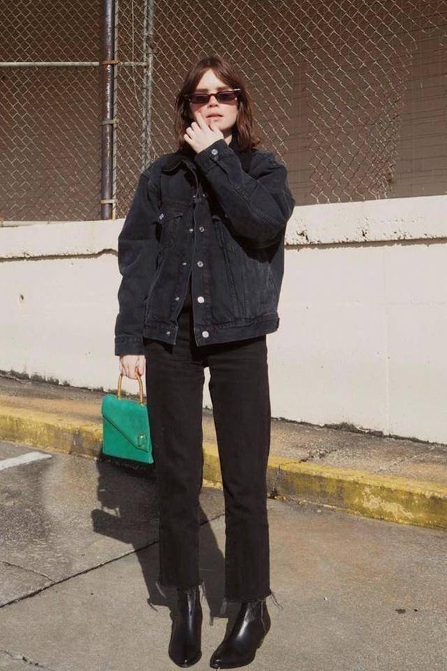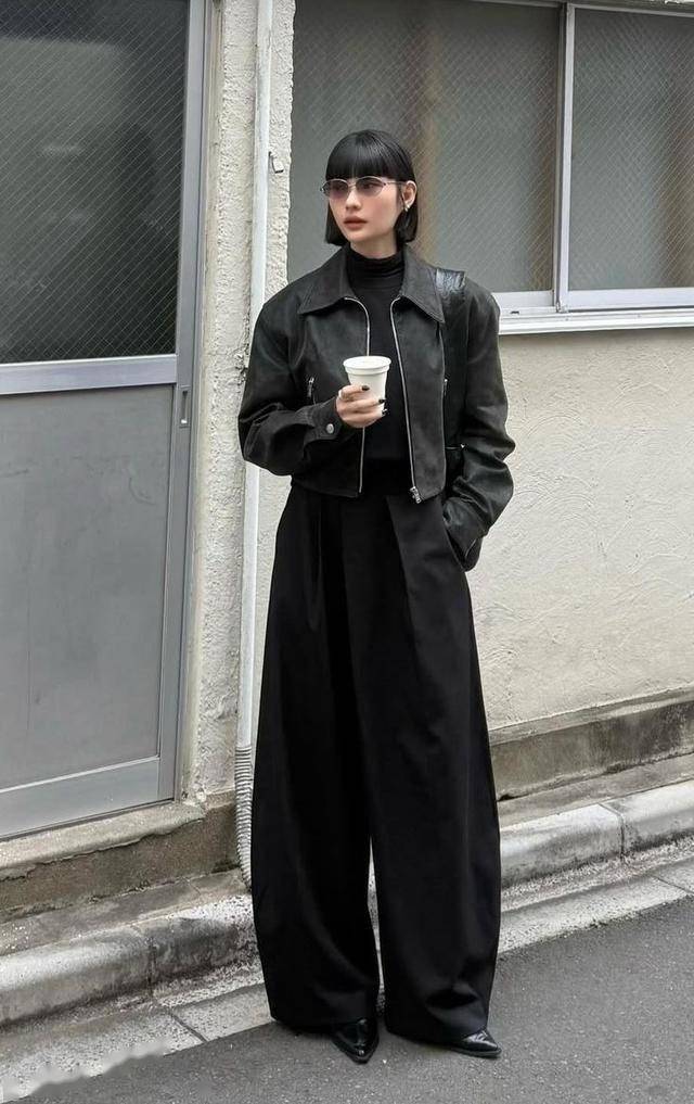 黑色皮衣最適合玩轉“一身黑”的穿法,搭配黑色牛仔闊腿褲,帥氣和休閑的碰撞,平添了幾分腔調。