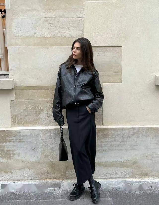 皮衣的酷颯,邂逅長裙的浪漫,二者形成對比,內搭白T恤,立馬豐富造型,穿出了別具一格的美。