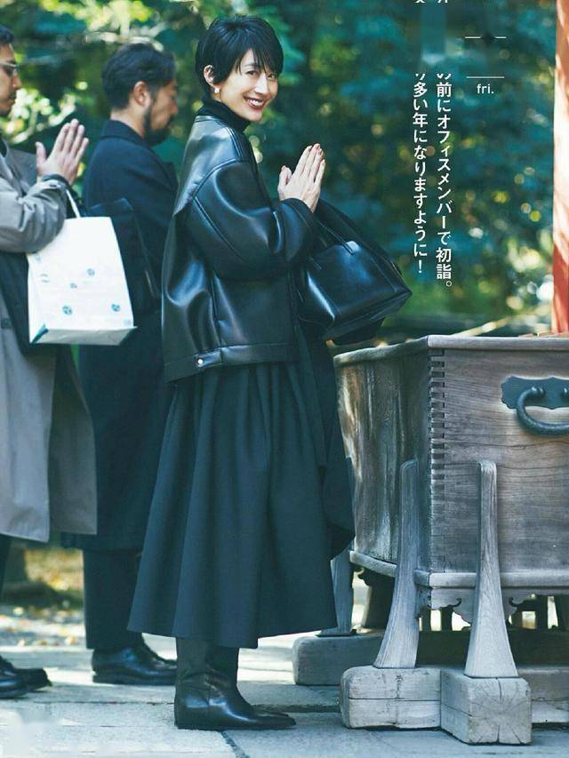 挺闊有型的皮夾克,被傘裙烘托出了柔和之美,戴對金色耳環,又增添了一絲貴氣感,又美又颯!
