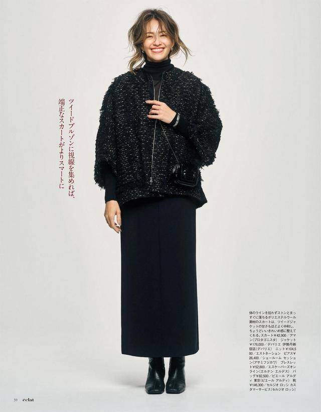 肌理感十足的小香風外套,和黑色是天生一對,搭配直筒版型的黑色長裙,“繁簡結合”盡顯平衡感。
