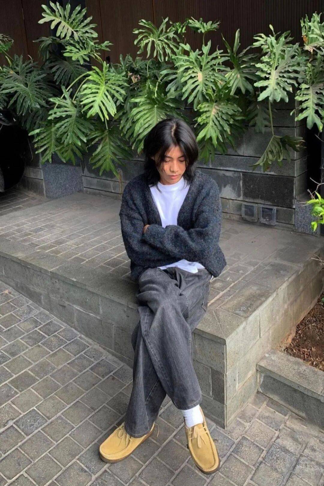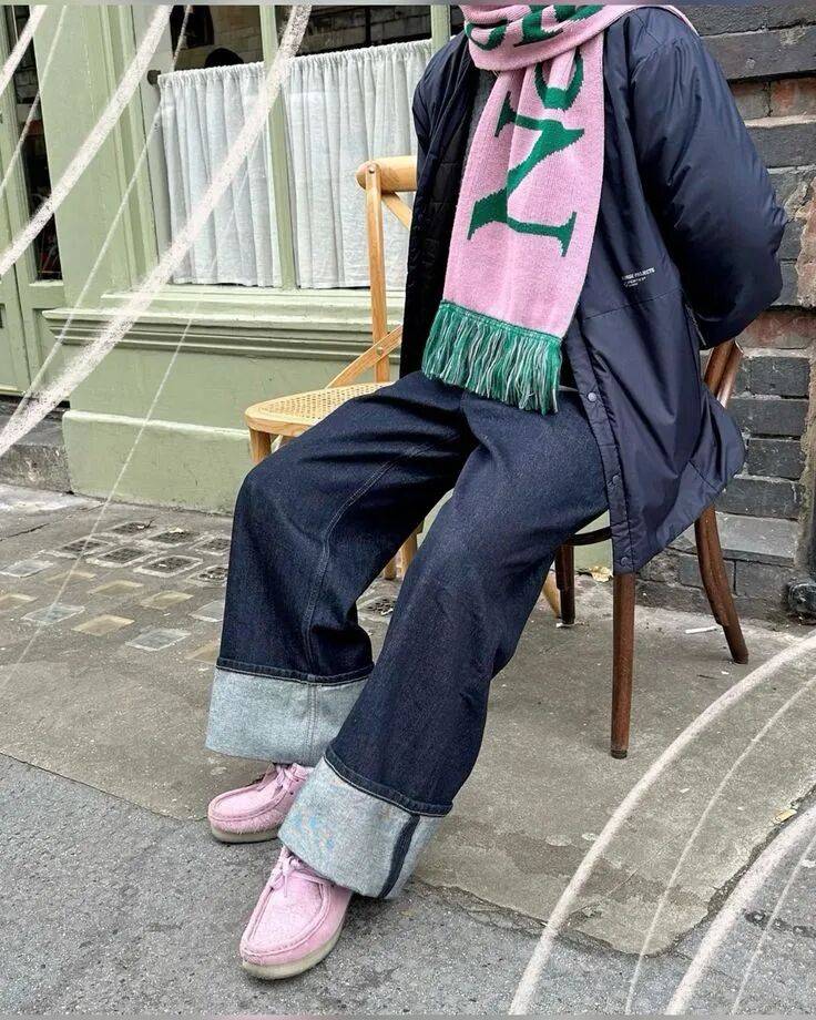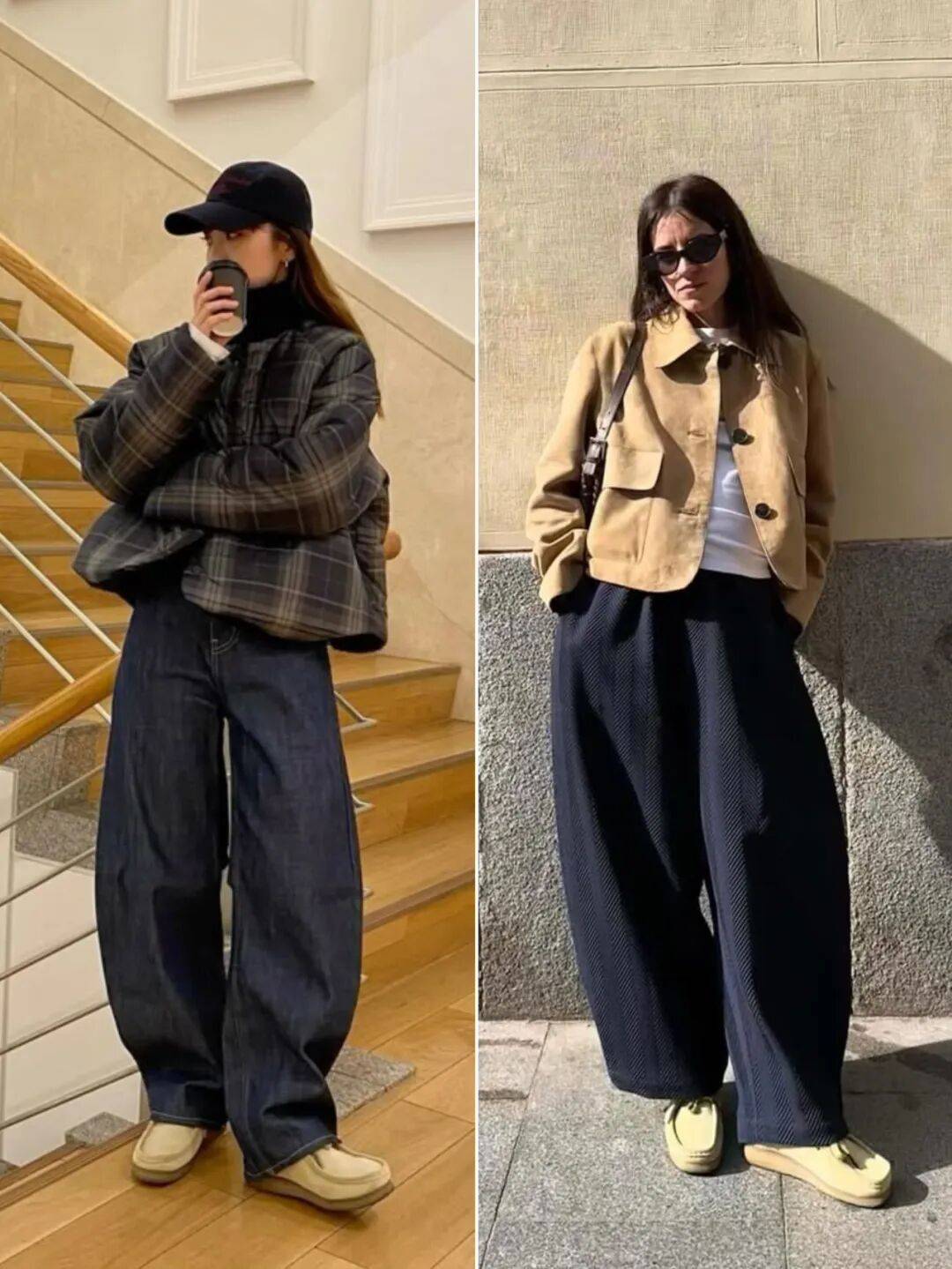 袋鼠鞋和今年超火的彎刀褲也很適配,不過彎刀褲更適合高個子,小個子如果想嚐試這個搭配可以穿短款外套來優化比例。▼