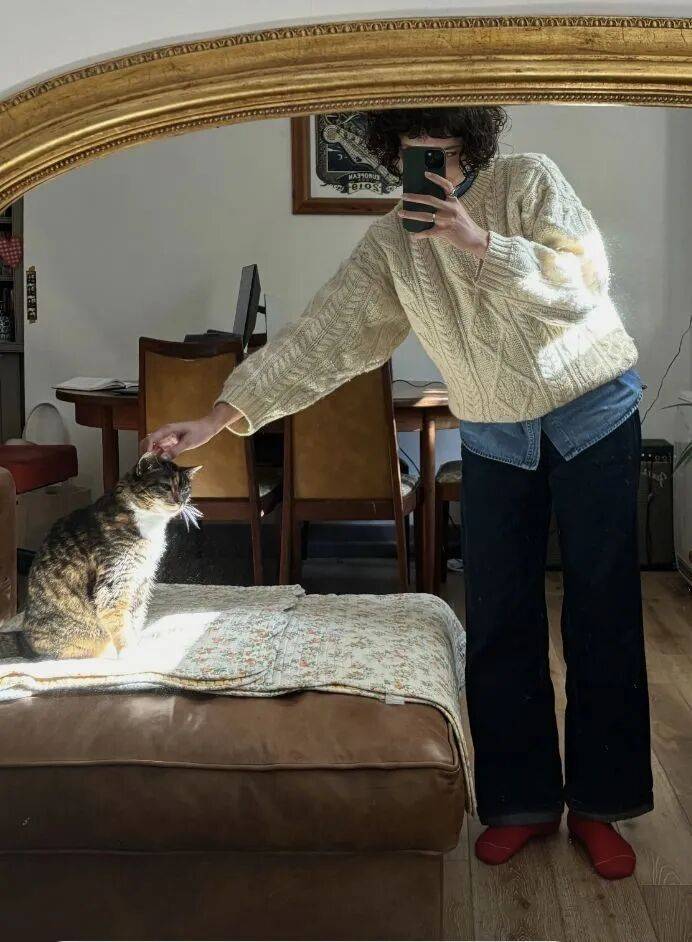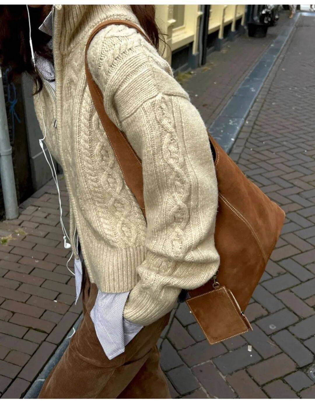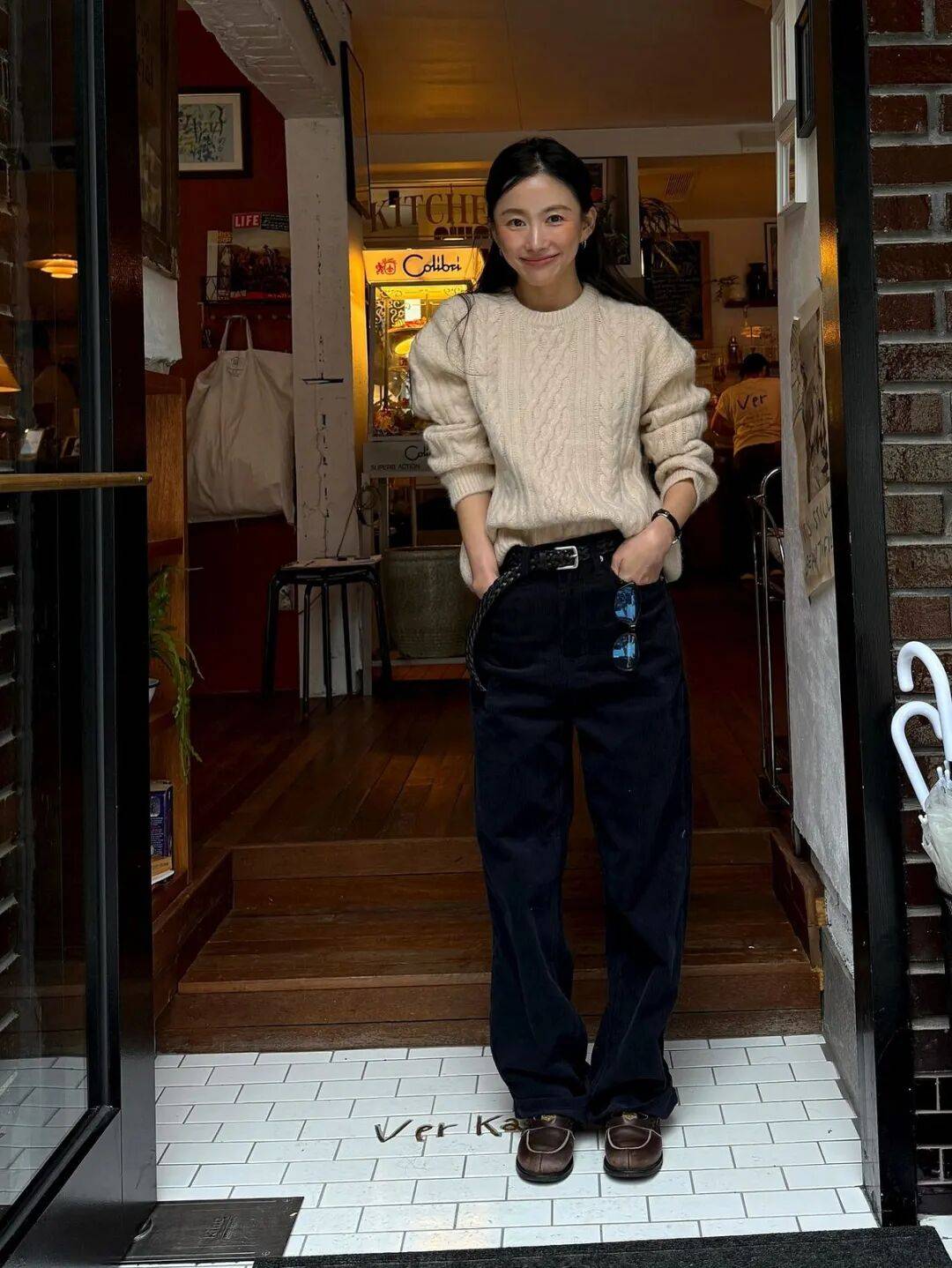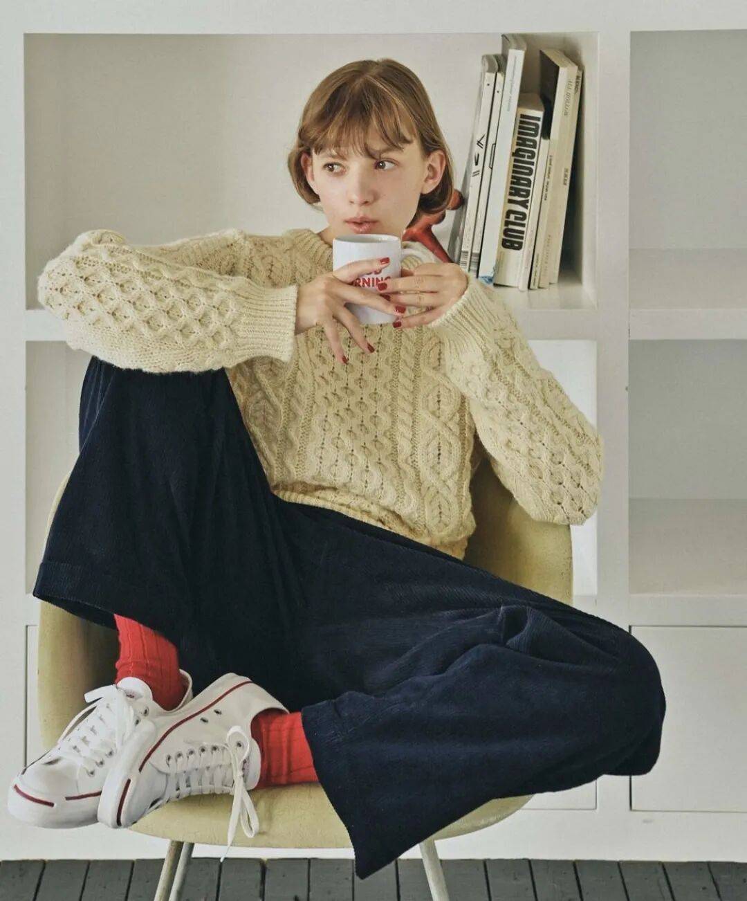 燈芯絨材質同樣是絞花毛衣的好夥伴,一起搭配是複古溫暖的冬日氛圍感。▼