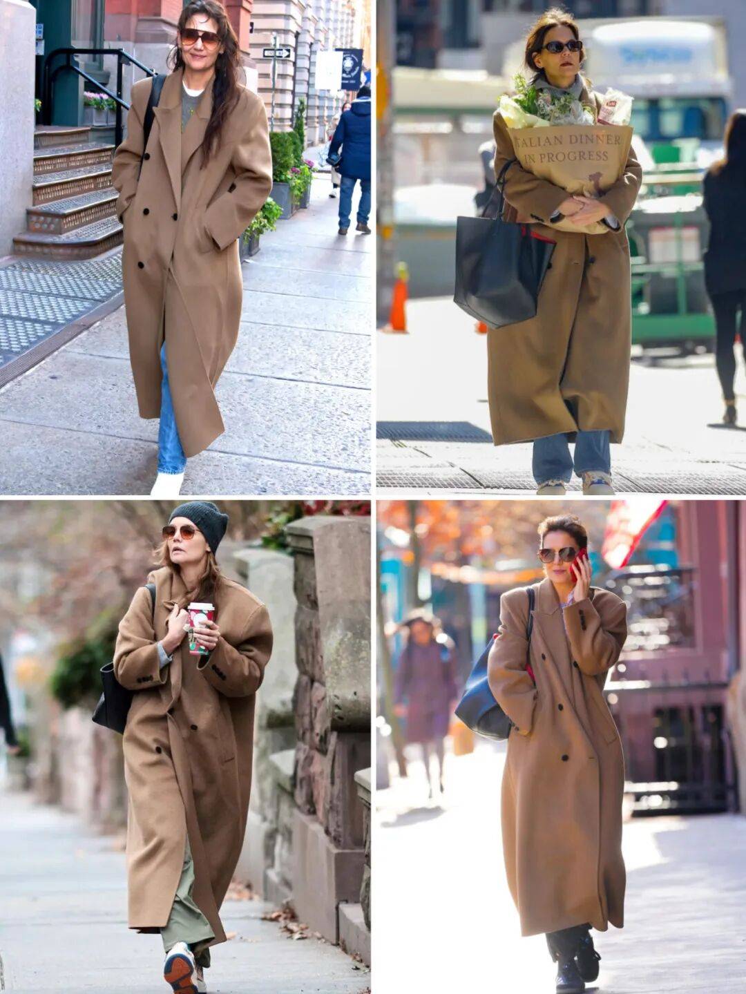2023年末開始,凱蒂·霍爾姆斯(Katie Holmes)的秋冬穿搭裏就高頻出現這件3500元的駝色大衣。▼