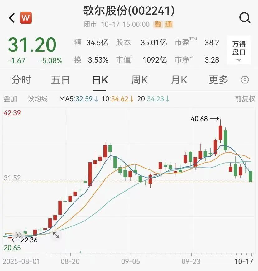 二級市場表現上,自7月22日高調宣布籌劃收購以來,歌爾股份股價一路上行,期間市值站上千億元,10月9日漲破40元/股後逐步下探,截至10月17日收盤,報31.2元/股,總市值1092億元,股價累計上漲超35%,市值增長約261億元。