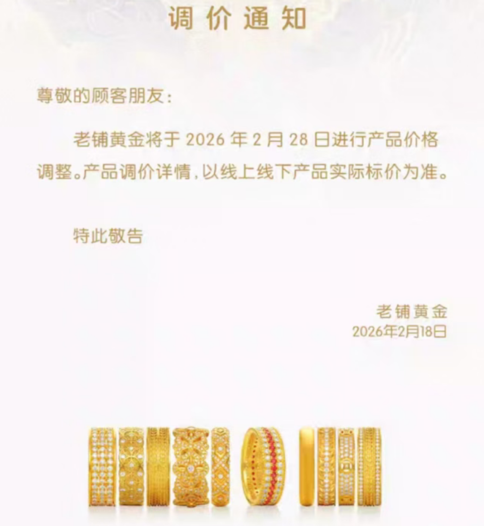 2月18日,高端黃金珠寶品牌老鋪黃金正式發布調價通知,宣布將於2月28日對全線產品進行價格調整。通知顯示,具體調價詳情以線上線下產品實際標價為準。