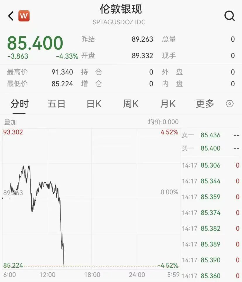 黃金白銀突發斷崖式跳水,現貨黃金小幅下跌0.4%,跌至5300美元/盎司附近,現貨白銀跌超4%,報85.4美元/盎司,盤中最高一度觸及91美元/盎司上方。(詳情)