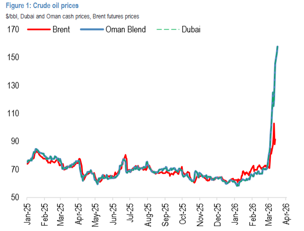 相比之下,迪拜和阿曼原油作為中東基準,直接暴露於出口中斷的衝擊之下,能更有效地捕捉邊際稀缺性。兩者現貨價格當前均已觸及155美元/桶。