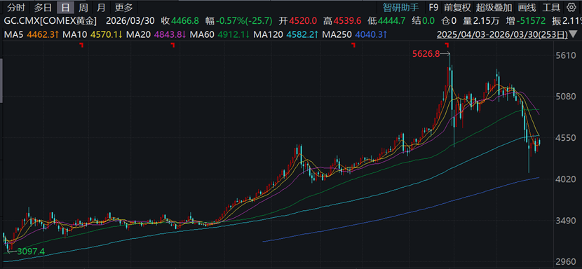3月下旬以來,國際金價上演“史詩級”巨震,現貨黃金整體處於震蕩拉鋸階段。截至3月27日(周五)收盤,COMEX黃金期貨報4489.70美元/盎司,周跌1.86%。有分析人士稱,地緣政治緊張推升避險情緒,美國經濟數據顯示通脹高位與消費者信心不足,共同提振黃金等避險抗通脹資產需求。