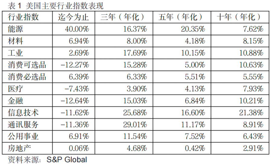 迄今為止,今年道瓊斯30種工業股票平均指數、標準普爾500指數、納斯達克指數分別跌了6.03%、6.98%、9.82%,但行業表現差異較大。如表1所示,表現較好的行業依次為能源、材料、消費必選品、公用事業、工業,較差的是金融、消費可選品、信息技術、通訊服務。