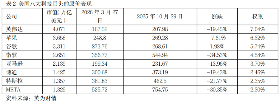 科技巨頭表現尤其令人失望。自去年10月29日以來,標準普爾500指數下跌了7.84%,八大科技股就貢獻了70.44%的跌幅,說明投資者對AI投資越來越不看好,但其他行業卻難以扛起大旗。如表2,除穀歌外,其餘七隻股票均呈現不同程度的跌幅。受AI技術衝擊最大的是微軟(軟件+雲服務)、META(臉書)、英偉達(芯片)、博通(芯片)、亞馬遜(雲服務+電商),特斯拉的日子也不好過。穀歌儼然是個攪局者,前不久發布的KV緩存壓縮技術直接動了存儲公司的“奶酪”,導致美光、希捷、閃迪、西部數據股票大跌。