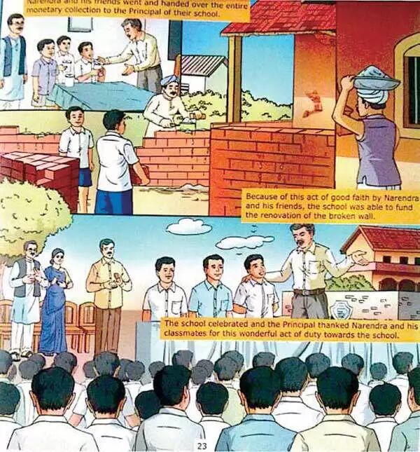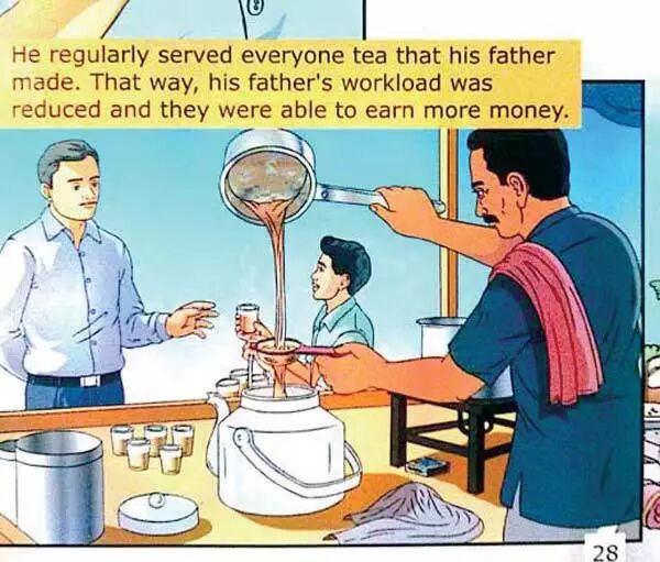 在很多印度人心中,他們的總理莫迪如神一樣地存在。他從茶水小夥到印度總理的故事在民間廣為傳送。然而,他的童年故事遠不止為軍隊送茶水,還文能刻苦讀書、武能做體育健將、樹上救小鳥、水中捉鱷魚……完美得如同那幾位金將軍。這就是人民黨宣傳機器推出的漫畫《莫迪的童年故事》。現在,小莫迪如何不惜成本賣好茶的雞湯文也傳到了中國。