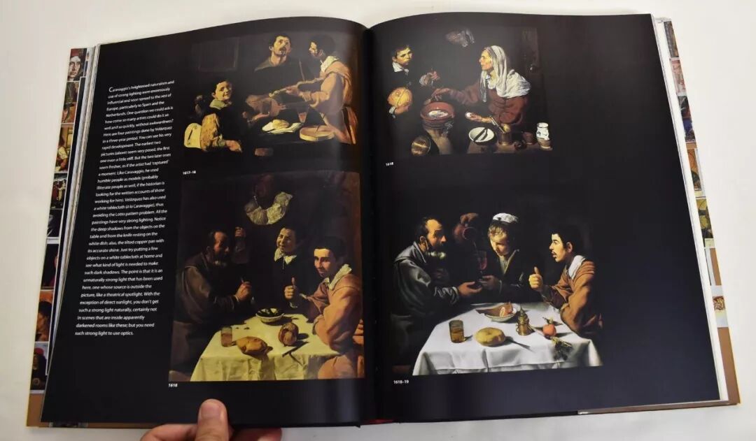 霍克尼甚至重新演繹卡拉瓦喬繪製《紙牌騙局》的過程,結果發現,畫中的三人是分三次畫上去的,畫布在畫架上移來移去,讓每個人物投影都落在恰當的位置。但人物間由於缺乏空間景深感,視覺效果如同拚貼。