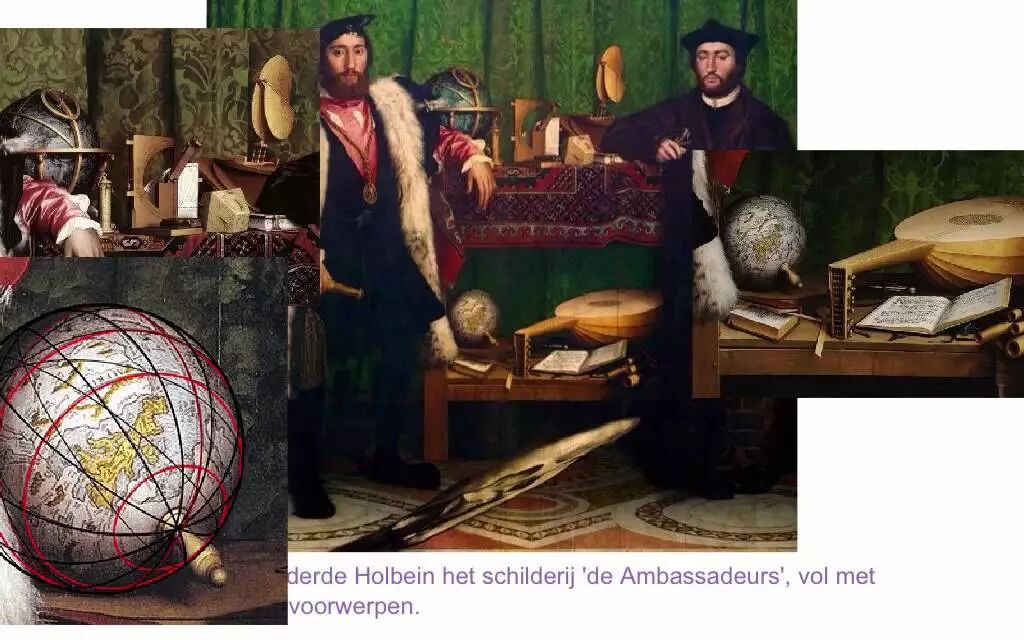 霍爾拜因《兩大使》中的局部,也因為繪畫過程中必須移動透鏡重新對焦,所以兩本書的滅點不在同一高度,即視線從不同高度觀察物象。這是大師在徒手作畫時絕不會出現的低級錯誤。