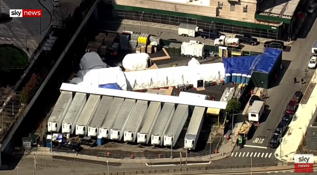 冷藏卡車停在紐約某醫院門口作為臨時停屍房(圖片來源:SKY TV截屏)