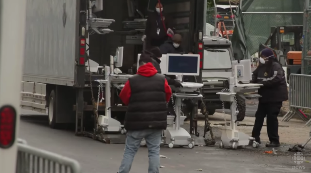 紐約某醫院門口,工作人員正在緊急運送急救醫療設備(圖片來源:CBC截屏)