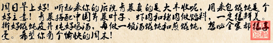 《晨光裏的餛飩香》 晨光漫過青瓷碗沿 昨夜的麵團在指間舒展成雲片 青菜與芹葉在竹籃裏呢喃 蝦肉透出淺緋色的甜 雞湯在砂鍋裏唱著歌謠 煎鍋上金黃的裙邊輕輕起翹 兩大盆青翠在晨光中消融 化作瓷勺裏月牙兒搖 周日的風穿過廚房紗簾 麵粉沾上袖口像初雪點點 生活原來就藏在 餡料與麵皮相擁的瞬間 窗台薄荷偷嚐了半匙鮮 煎餛飩在盤中綻成向日葵田 那些忙碌與等待 都化作晨光裏升騰的暖煙