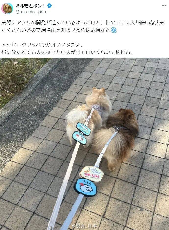 在狗繩上拴上“請摸我”、“YES”標識,上街散步時就可以釣到大量野生的想摸狗人士,效果拔群。 @mirumo_pon