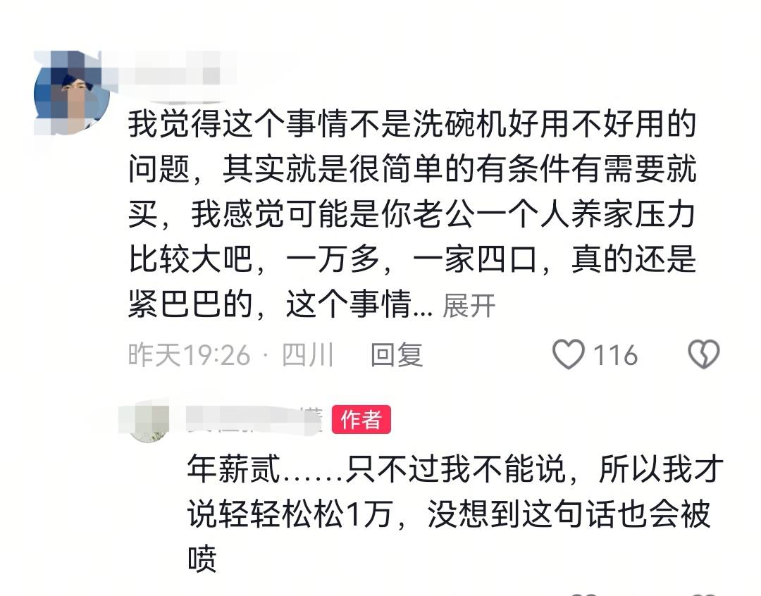 有網友說或許是丈夫工資不高,感覺壓力大,妻子說實際上丈夫的工資並不低,她擔心在網上引起不好的影響,就沒有說那麽多。