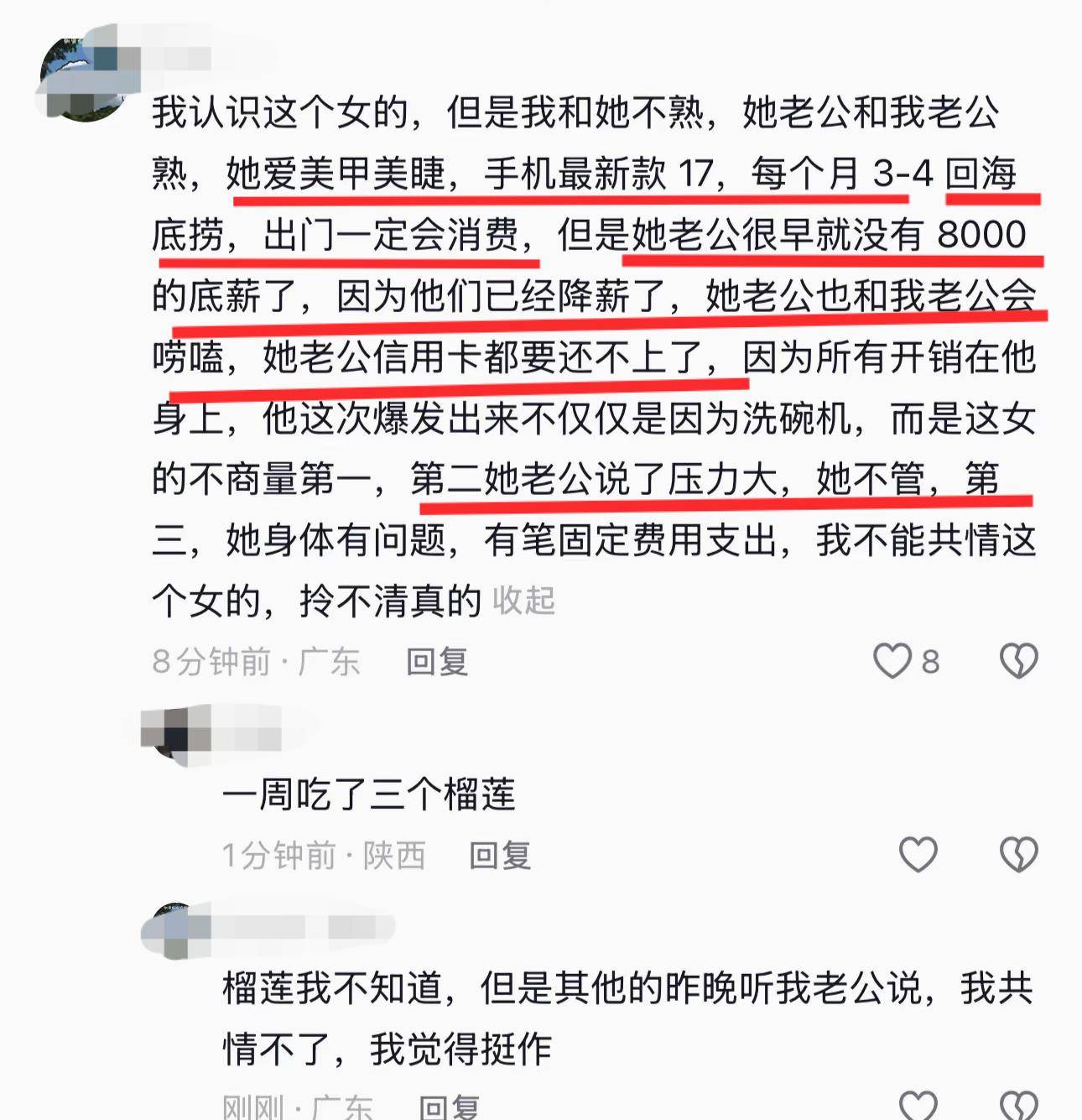 原來女主的老公和網友的老公非常熟,她說,女主丈夫早就不是8千底薪了,這個洗碗機女主非常喜歡美甲,手機也是新款的,他們家每個月固定好幾次海底撈,看來這個家庭的開銷並不低。