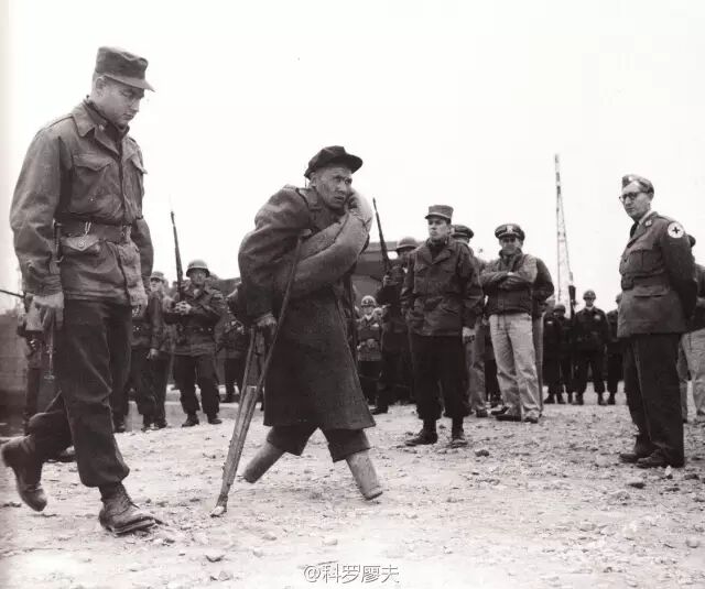 上圖是1953年3月,一名被釋放的無腿誌願軍戰俘走向祖國懷抱。看臉上毀容的傷疤,似乎是經受過美軍凝固汽油彈的攻擊。 *****
