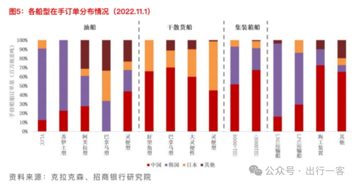 招商銀行研究院的研報數據顯示,截至2022年11月1日,尖端船舶領域仍由韓國占據主導地位。中國在好望角型、巴拿馬型等幹散貨船市場具有絕對優勢,韓國則在高附加值船型(如油船中的VLCC、蘇伊士型等和特殊船型中的液化天然氣LNG、液化石油氣LPG運輸船)以及大型船舶(如8000+TEU)這兩類細分船型市場中占據主導。