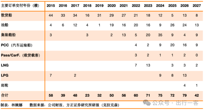 以龍頭企業中國船舶為例,《財經》梳理其曆年生產數據和未來預計交付發現,其生產結構主要由散貨船、油船、集裝箱船三類構成,在2022年,其產品交付結構首次出現較大變動,交付了4艘汽車運輸船、3艘客滾船以及7艘LNG。而在後續預計的交付中,新船型的數量繼續增加,並且預計在2026年,其將首次交付4艘郵輪。