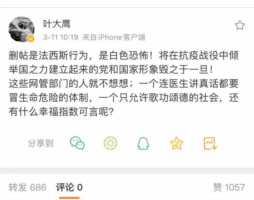 【這盛世如誰所願?】這邊奮戰在抗疫第一線,那邊堅守在刪帖第一線!這就是所謂的正能量!領導司機出入紅會倉庫隨便拿口罩,而一線的醫生卻急缺口罩,危重病人住不了院,在家裏等著熬死。有些危急病人在苦熬中去世,沒等來確診,也沒等來統計數字,等來的隻是拉走屍體的殯儀車!如此人命比得上螻蟻?! pic.twitter.com/I4XpaMUGZq