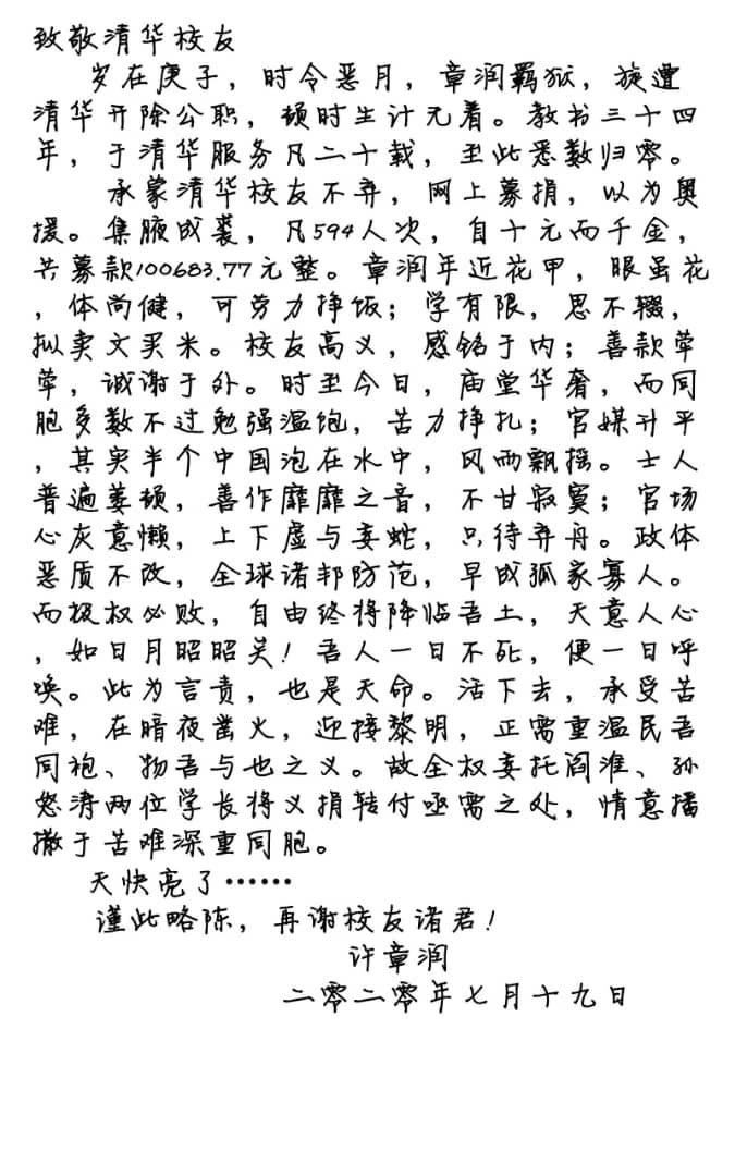 他被剝奪了生活資源,他的校友閻淮發起了僅限於北京地區清華校友的募款活動,僅一日,募得10萬多元,然而許章潤7月19日在致清華校友的公開信中婉拒了他們的好意,言其教書34年,於清華服務20載,遭後者開除,頓時生計無著,但自己“可勞力掙飯”,也打算“賣文買米”。簡陳個人處境心境,筆調一轉,議論起當下時局,犀利點出:官媒上一片太平,其實半個中國泡在水中,風雨飄搖,知識分子“普遍萎頓,善作靡靡之音”,“官場心灰意冷,虛與委蛇”;中國“政體惡質不改,全球諸邦防範,早成孤家寡人”,但他相信“極權必敗,自由終將降臨吾土,天意人心,如日月昭昭矣”。