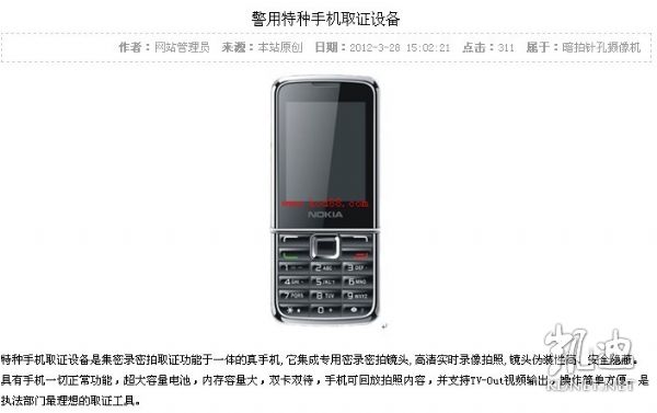特種手機取證設備是集密錄密拍取證功能於一體的真手機,它集成專用密錄密拍鏡頭,高清實時錄像拍照,鏡頭偽裝性高、安全隱蔽。具有手機一切正常功能,超大容量電池,內存容量大,雙卡雙待,手機可回放拍照內容,並支持TV-Out視頻輸出,操作簡單方便。是執法部門最理想的取證工具。