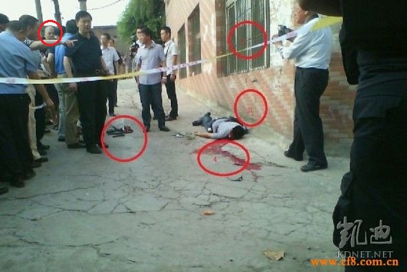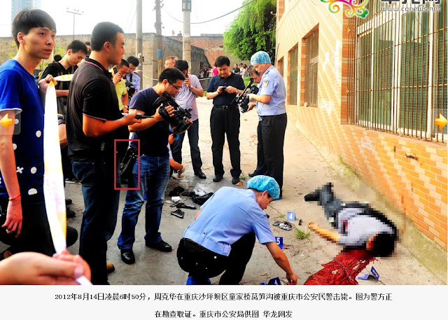 上麵的照片應該是中國警方內部人員有意發到網上的,照片中的幾個便衣警察以及被打死的周克華都背著同樣的警用背包,網友指這些人是死者的同事同夥,他們怒指光頭警察王曉瑜,齊聲為死者討說法。