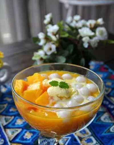 5.把芒果泥倒出裝在容器中,撒上芒果粒,再把煮好的小圓子撈出瀝幹放在上麵即可。