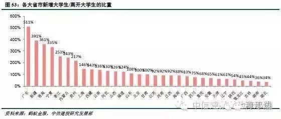 ●省市間潛在高素質人口供給的差異。我們用各省市大學新增大學生/離開大學生的比重來計算省市之間大學生供給的差異。供給增速最高的十大省份分別是,廣東、新疆、青海、寧夏、浙江、內蒙古、貴州、上海、西藏、雲南,其中除了廣東、浙江和上海一如既往的優秀,其他全部為中西部省份,我們認為這其中一方麵和基數有關,另一方麵也印證了當前西部大開發以及“一帶一路”政策下相關教育資源的側重。而供給增速最低的十大省市分別為:湖北、湖南、吉林、黑龍江、山西、遼寧、天津、安徽、重慶、四川,其中除了天津,全部是人口輸出大省,東三省皆上榜,也顯示出這些省市人口外遷後帶來的高素質人口潛在供應下降。