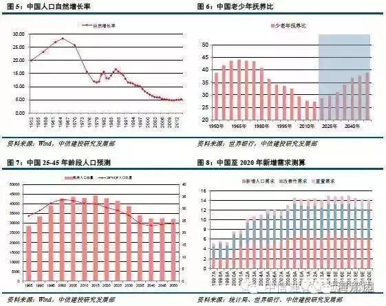 但進入“十二五”末,人口紅利的可持續性已經成為各個學界關注的問題。一方麵,人口總量增速開始下行,人口自然增長率已經下降至5%以下,老齡化問題日趨嚴重,另一方麵,勞動力人口占比也出現拐頭,撫養比正逐步抬升。我們此前在年度策略中做過測算,主流城市的購房年齡段主要集中於25-34歲和35-44歲,這部分人群從2015年開始,占比下滑斜率將逐步加大,雖然我們認為在2025年以前,25-44歲人口的總量依然可以穩定在4億左右,但從大趨勢來看,人口紅利的下降已經成為不可回避的話題。