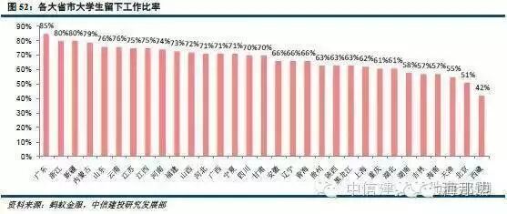 ●部分中西部區域出現大學生淨流入。根據數據,內蒙古、新疆和貴州省成為大學生淨流入的省份,分列排行榜5、6、7位,這和我們之前觀察到的淨流出情況不同,說明近幾年中西部人口流失呈現一定程度的止血態勢,高素質人口的導入也為這些省市的經濟發展帶來契機。
