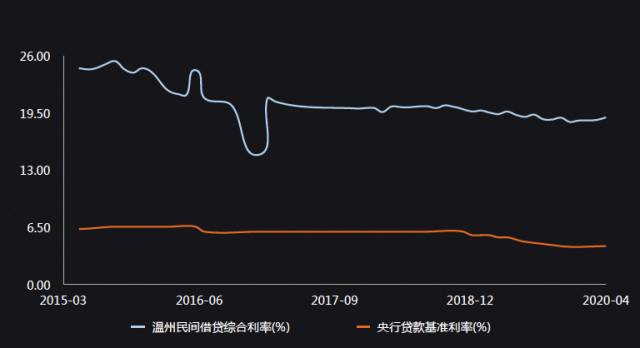我們來看一下,藍線是溫州的民間綜合借貸利率,黃線是央行的基準利率,我們可以看得非常非常清楚,藍線遠遠高於黃線,基本上整個藍線的利率是大概在20%左右徘徊。什麽意思?大家可以想一想,如果我們去借我們的信用卡,它的年化利率月息大概1.5%,年化是18%左右,跟民間的借貸利率相仿。