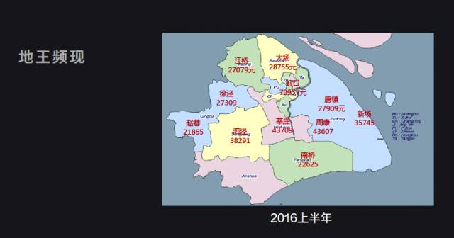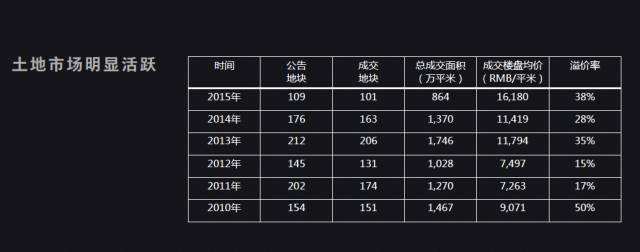 上海從土地市場來看,我們看到也有一些變化,如圖,2010年,上海的市場很熱,土地市場也很熱,所以成交的土地單價達到了9000塊,當時的漲幅是50%,2011年市場下來了,土地成交單價是7000塊左右,漲幅隻有17%,2012年市場照樣很熱,土地還是隻有7500左右,漲幅是15%。2013年市場已經開始走熱了,所以成交單價到了11000左右,溢價率到了35%。2014年市場走弱,所以土地的平均成交均價幾乎沒有變化。到2015年,成交額比2014年漲了50%,溢價率達到38%。
