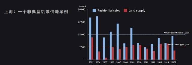 一定會有,如果每年賣掉的住宅都是超過他的土地供應,請問這些住宅哪裏來?秘密在這裏,秘密在2003年之前,在2003年之前的10年裏上海也有土地供應。跟很多地方一樣,之前的土地供應相對來說比較混亂,比較無序。但是正是這種混亂和無序積累了大量存量的土地,這些土地在規範市場之後,仍然可以慢慢進入這個市場。但是大家也可以看到一個推論,這些土地在每年都在消耗,這樣消耗13年以後,它對市場的影響是越來越弱了。所以大家可以看到,在過去我們縮減土地供應,還有這些存量可以幫忙,現在我們縮減土地供應,價格就快速上升了。