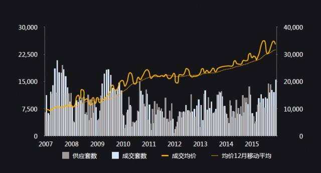 這個是2007年到2015年上海樓市的平均走勢,黃線是它的月成交價格,黃色虛線是12個月的平均移動價格。這個圖表我們可以清晰地看到,每一輪調控都是有效的,每一輪調控都深深地打擊了未來3-6個月的成交,可能也進而引起了當時的一個短期價格。不過從長期來看,調控幾乎對成交價格是無效的,它並不能改變房價上漲的趨勢。