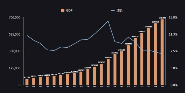 經濟增長大家收入增加了,財富增加了,所以房價上漲了,名義經濟增長和實際增長之後的一個差異。大家可以看到在1995年,中國全國GDP大概在6萬億左右,2015年中國的GDP是67萬億,整整增長了11倍。