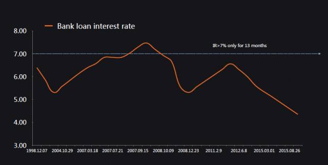 這裏說起1998年到現在,中國的人民銀行給的基礎利率走勢,跟我們很多的直覺相反,我們可以看到在高增長的經濟因素背景下,基礎利率高於7%的年份隻有三個月,大部分年份中國的利率在6%上下波動,什麽意思呢?