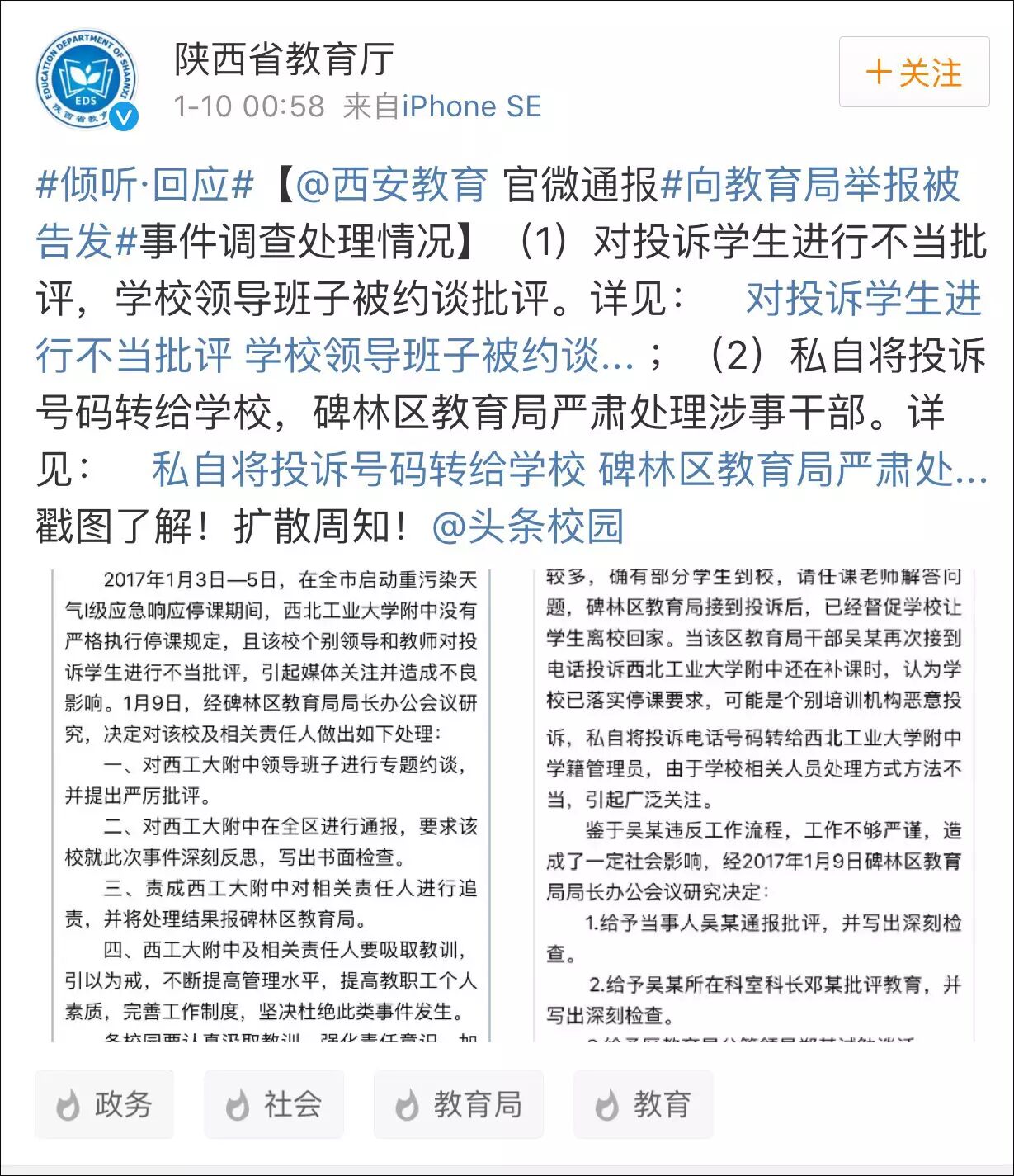 此外,針對學校對投訴學生進行不當批評,當地教育局對西工大附中領導班子進行專題約談,並提出嚴厲批評;對西工大附中在全區進行通報,要求該校就此次事件深刻反思,寫出書麵檢查。