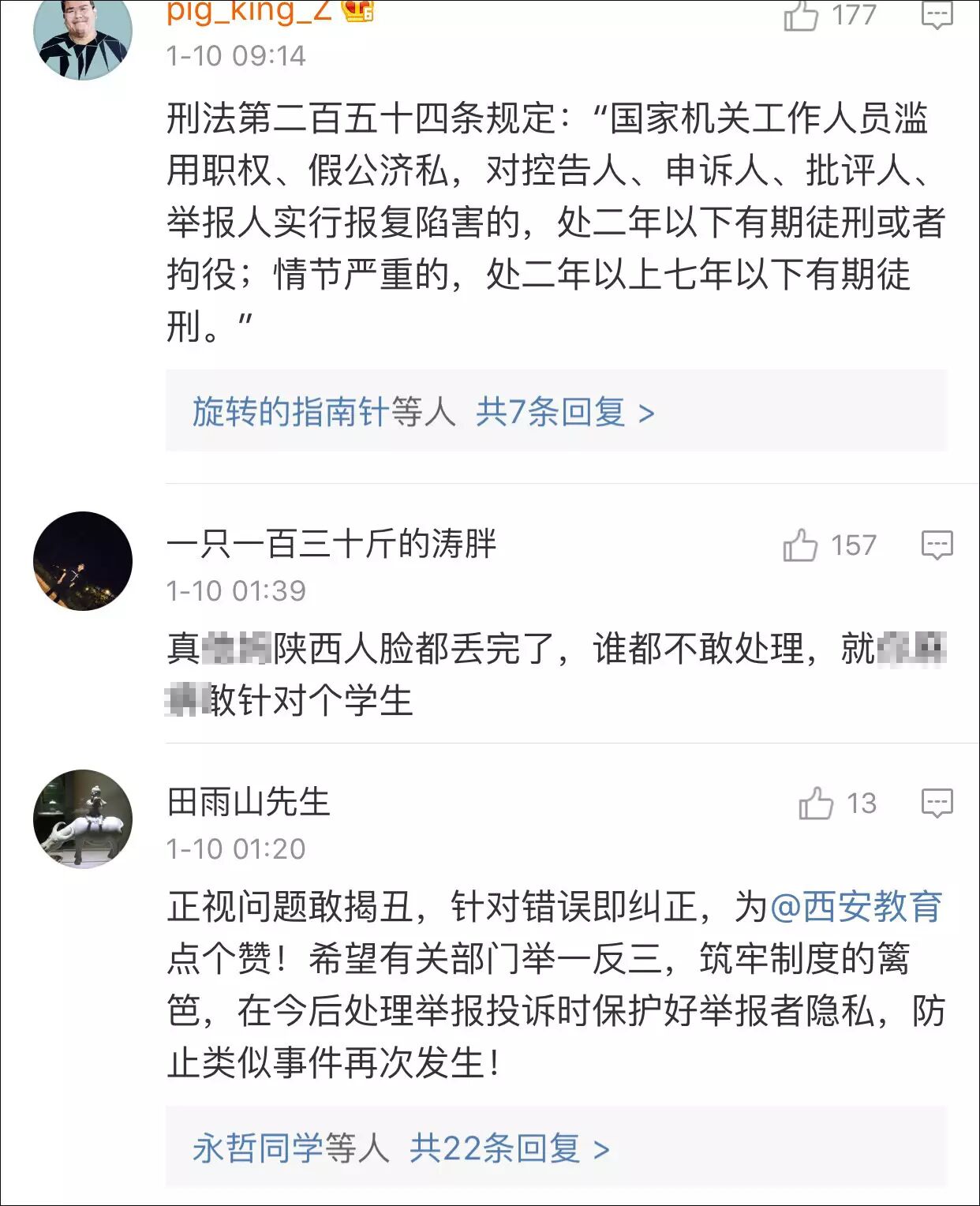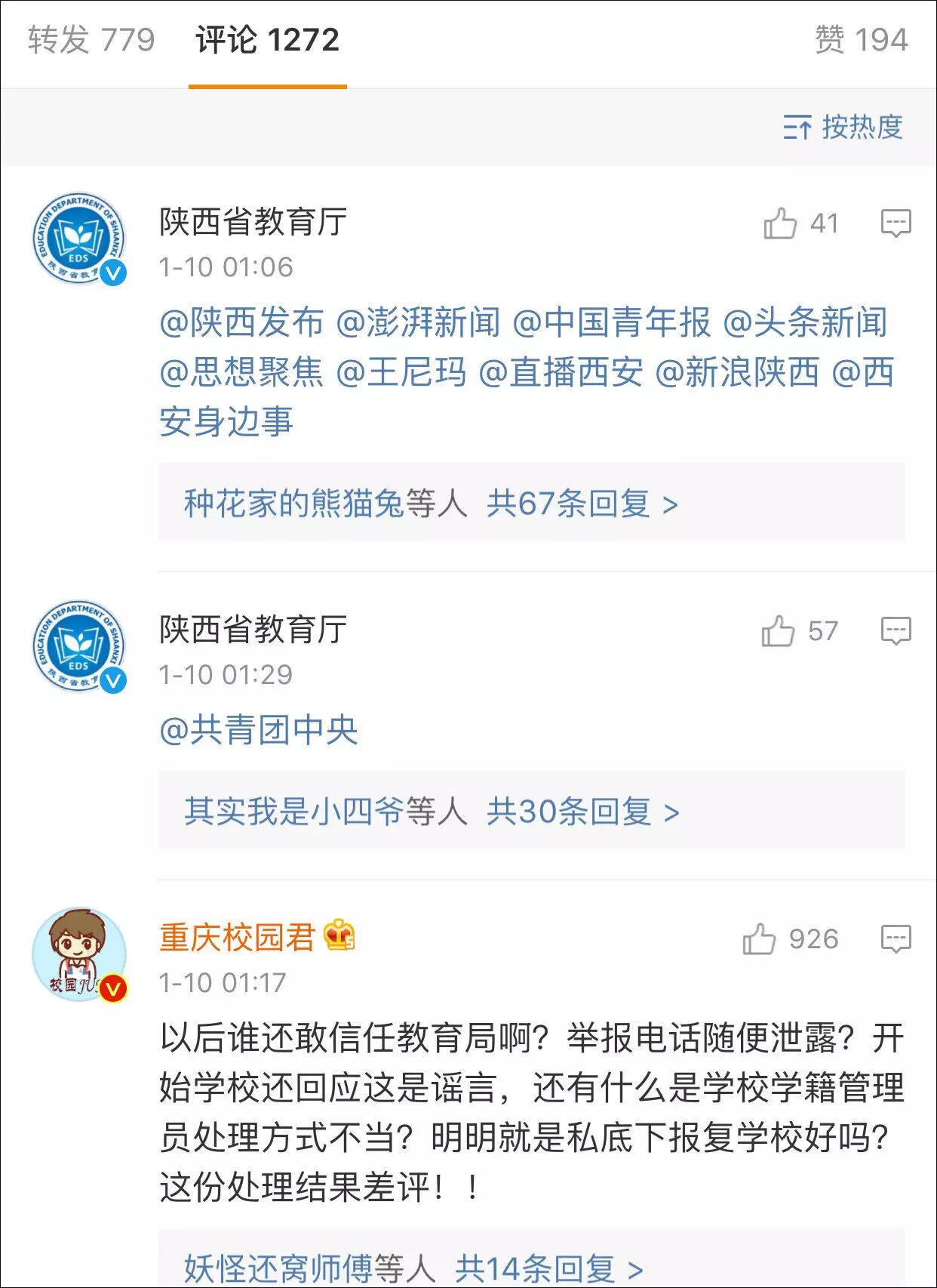 截至觀察者網發稿,陝西教育廳的這條處理結果微博已經獲得1700多條評論,不少網民質疑,作為國家工作人員,泄露舉報人信息,當事學校還對舉報的學生進行“報複”,性質都很惡劣;也有人認為,正視問題,敢於揭露,支持當地教育局的處理結果。