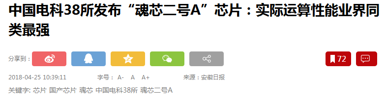 補給:美國封殺中興後,形勢非常嚴峻。國家多次強調,必須要自己掌握核心技術。4月23日,中電科38所展示了其完全自主研發設計的芯片——魂芯2A,空軍預警機已率先使用,單核性能超同類產品4倍!