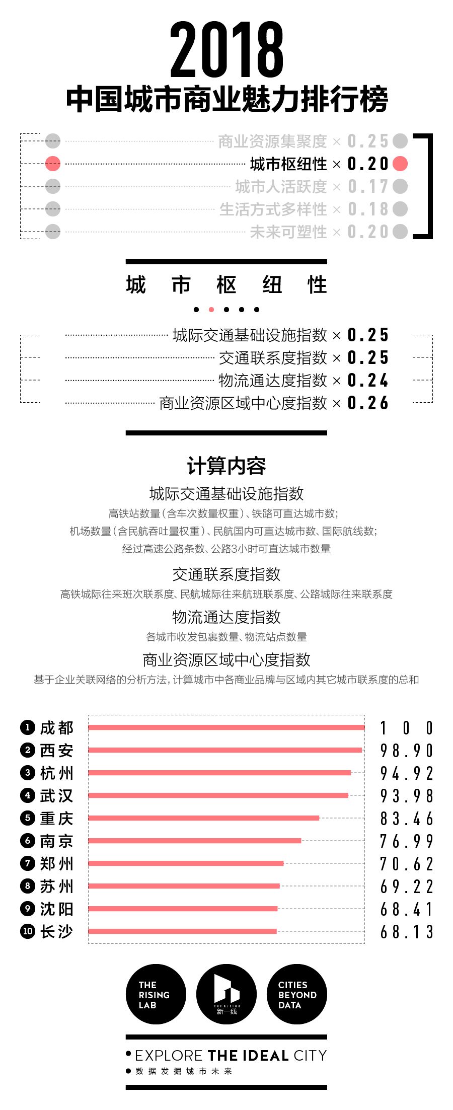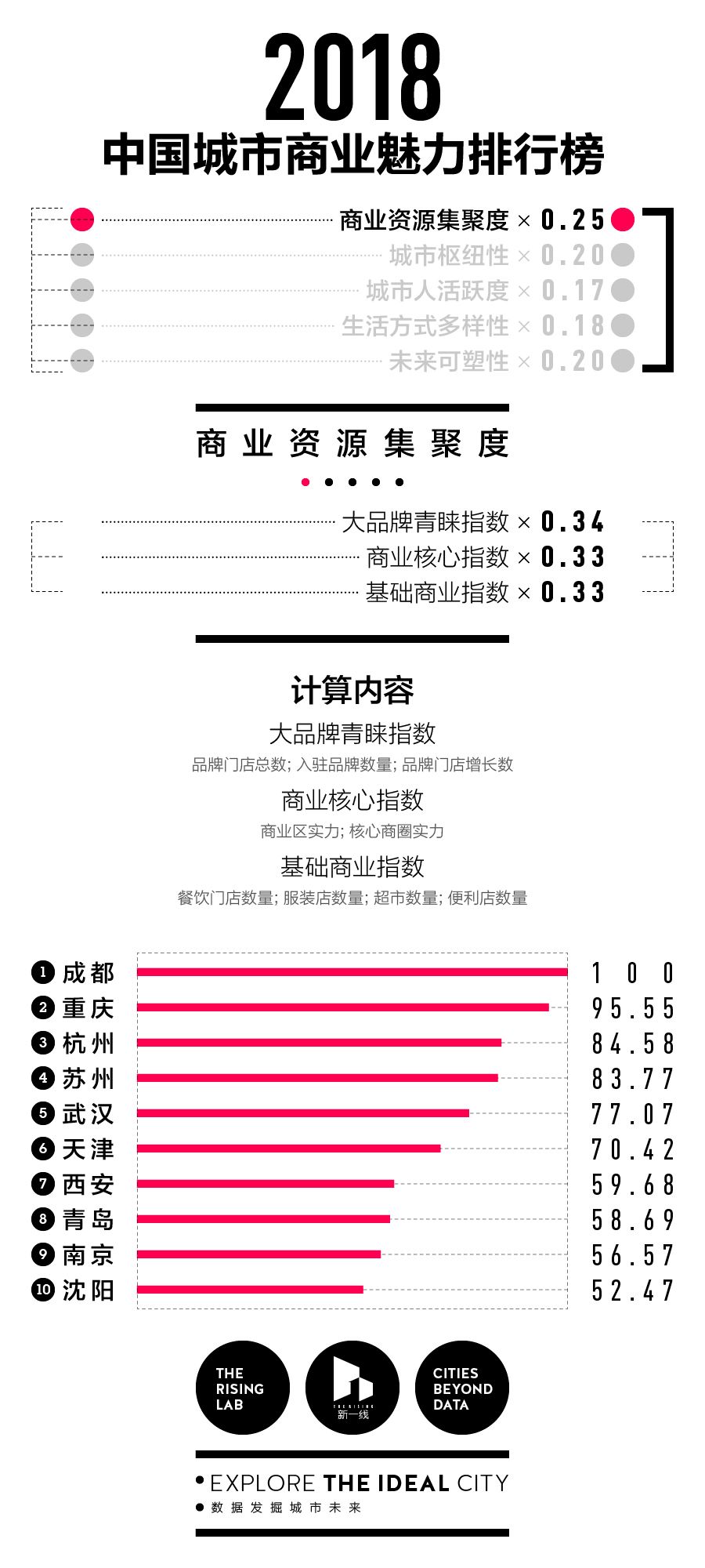 為保證榜單的延續性與可比性,這份2018年最新的城市商業魅力排行榜沿用了上一年的商業資源集聚度、城市樞紐性、城市人活躍度、生活方式多樣性和未來可塑性五大指標,並維持了原有的算法框架:一級指數的權重以新一線城市研究所專家委員會打分的方式計入,二級指數以下的數據則采用主成分分析法。