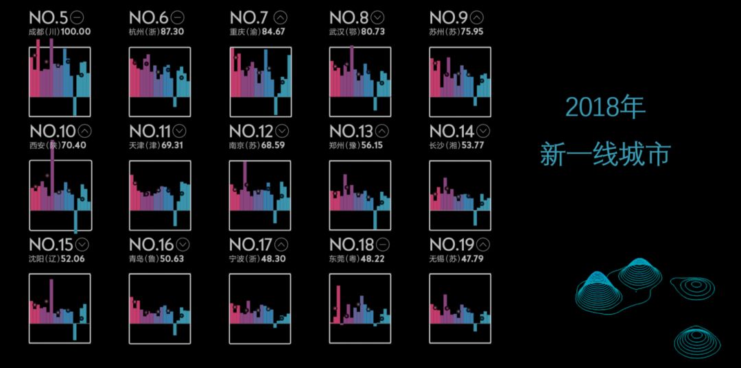 在新一線城市中,無錫經過一年的蟄伏重返新一線;重慶、蘇州、鄭州是位次連續3年上升的3個城市。而東北城市持續衰落,沈陽的排名下降了1位,大連已經跌出新一線城市名單,落到昆明之後的第21位。