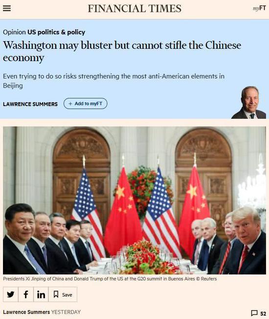 薩默斯12月4日在英國《金融時報》刊發評論文章:《華盛頓可以咆哮卻無法扼殺中國經濟》
