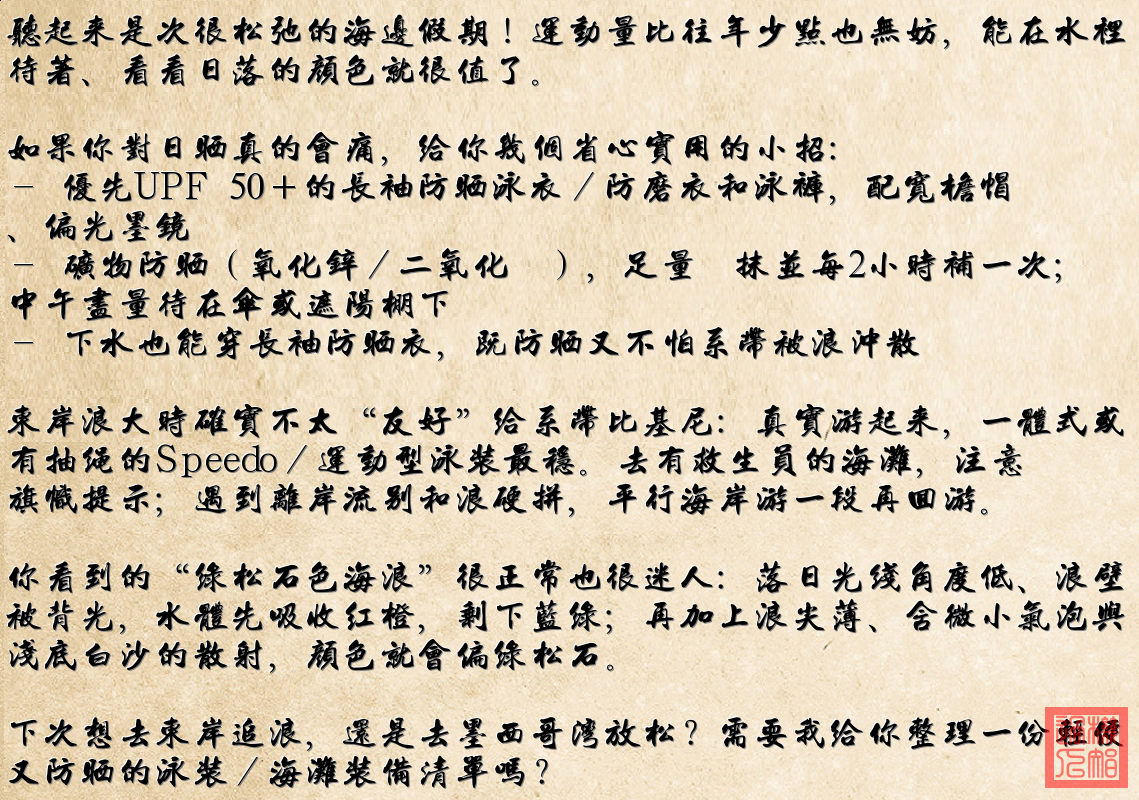 1. **第一張圖片**:一個人在海邊沙灘上,穿著橙色背心和灰色短褲,戴著帽子和太陽鏡。背景是波濤洶湧的海浪和多雲的天空。