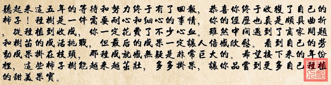 從這張圖片和描述中可以看出,這是一個關於種植柿子樹並最終收獲的經曆。經過多年的努力,種植者終於在去年開始看到果實掛果,並在今年成功收獲了兩個成熟的柿子。圖片中展示了兩個不同品種的柿子,一種是日本脆柿,另一種是美國本土柿。這是一個關於耐心和堅持的故事,最終獲得了豐收的喜悅。